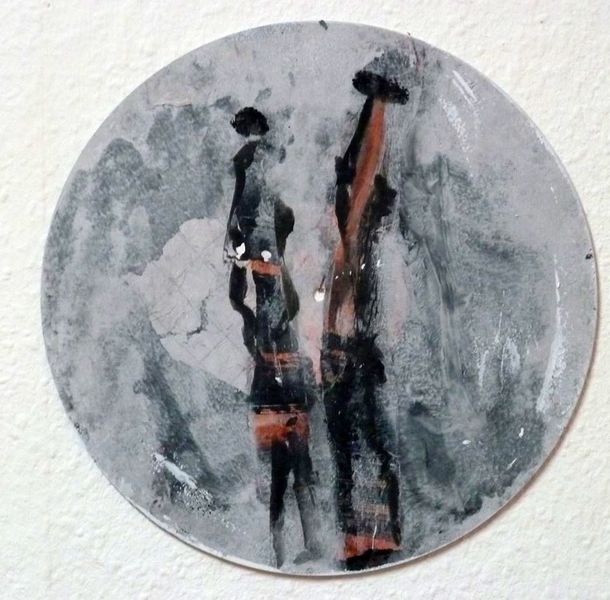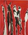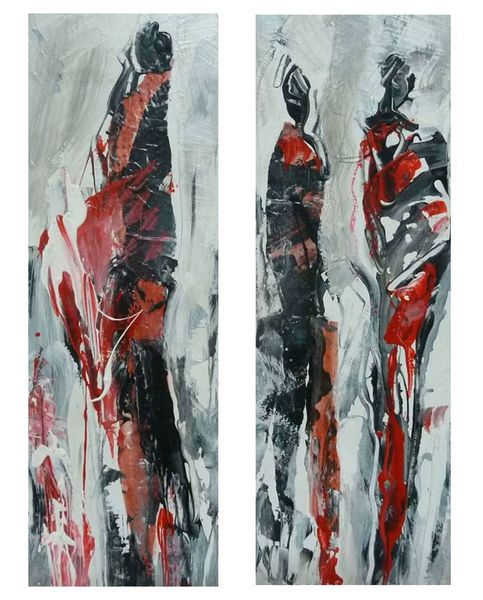 Die meisten mit Acrylfarben auf Leinwand gemalten Frauenfiguren spiegeln die Alltagswelt wieder. Sie stehen zusammen, kommen oder gehen. Bis an die Grenze des Erkennbaren werden die Silhouetten der